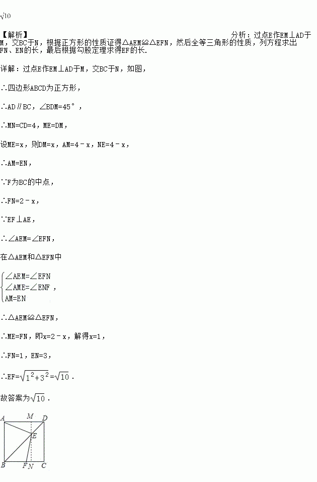 在正方形ABCD中,点E为对角线BD上一点,EF⊥AE交BC于点F,且F为BC的中点,若AB=4,则EF=_____.