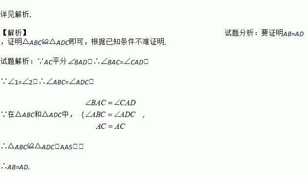 如图,已知AC平分∠BAD,∠1=∠2,求证:AB=AD.
