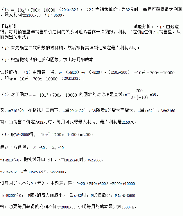(3)如果小明想要每月获得的利润不低于2000元,那么小明每月的成本最少需要多少元?(成本=进价×销售量)