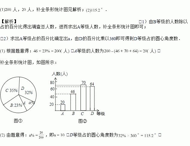 中,a等于多少?D等级所占的圆心角为多少度?![]()