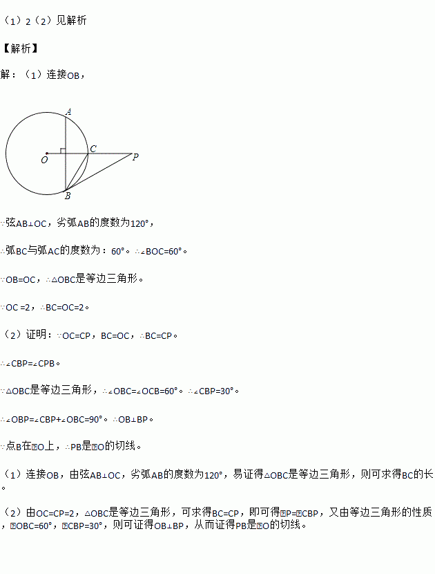 如图,已知P是⊙O外一点,PO交圆O于点C,OC=CP=2,弦AB⊥OC,劣弧AB的度数为120°,连接PB.
