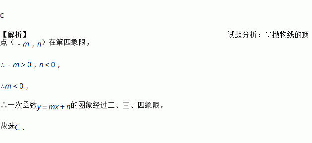C 【解析】试题分析:∵抛物线的顶点(-m,n)在第四象限, ∴-m>0,n<0, ∴m<0, ∴一次函数y=mx+n的图象经过二、三、四象限, 故选C.