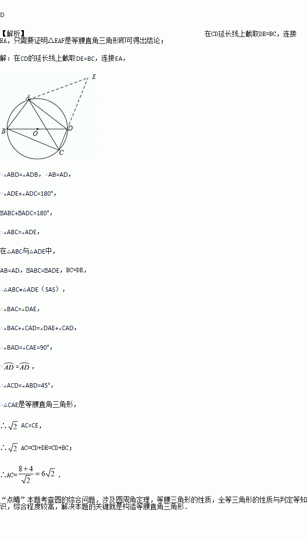 如图,点C为△ABD外接圆上的一点(点C不在上,且不与点B,D重合),且∠ACB=∠ABD=45°,若BC=8,CD=4,则AC的长为( )