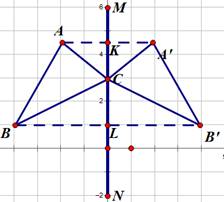 试题解析:如图,过点A作MN的垂线交MN与点K,延长AK至点A′,使得AK= A′K, 点A′是点A关于MN的对称点, 过点B作MN的垂线交MN与点L,延长BL至点B′,使得BL= B′L, 点B′是点B关于MN的对称点, 点C关于MN的对称点就是点C,连接A′B′C,得到图形△A′B′C.