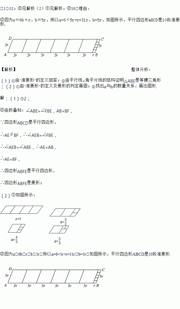 ②小明为了剪去一个菱形,进行如下操作:如图2,把□ABCD沿BE折叠(点E在AD上),使点A落在BC边上的点F,得到四边形ABFE.请证明四边形ABEF是菱形.