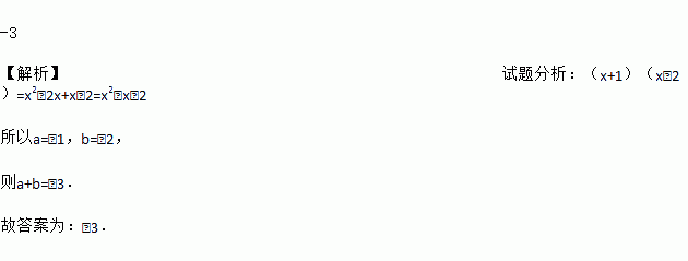 -3 【解析】试题分析:(x+1)(x﹣2)=x2﹣2x+x﹣2=x2﹣x﹣2 所以a=﹣1,b=﹣2, 则a+b=﹣3. 故答案为:﹣3.