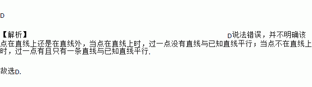 D 【解析】D说法错误,并不明确该点在直线上还是在直线外,当点在直线上时,过一点没有直线与已知直线平行;当点不在直线上时,过一点有且只有一条直线与已知直线平行. 故选D.