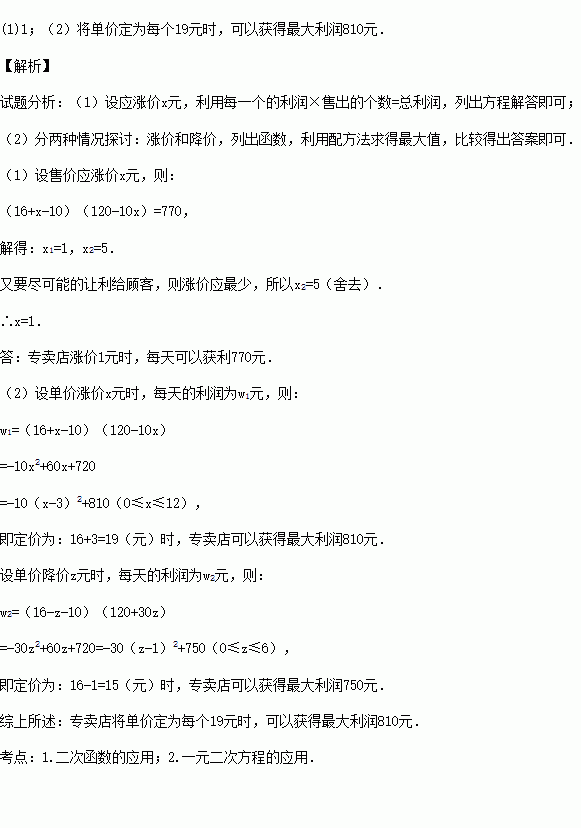 (1)如果专卖店每天要想获得770元的利润,且要尽可能的让利给顾客,那么售价应涨价多少元?