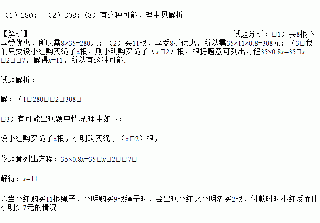 (3)小红比小明多买2根,付款时小红反而比小明少7元,你认为有这种可能吗?请结合方程知识说明理由.