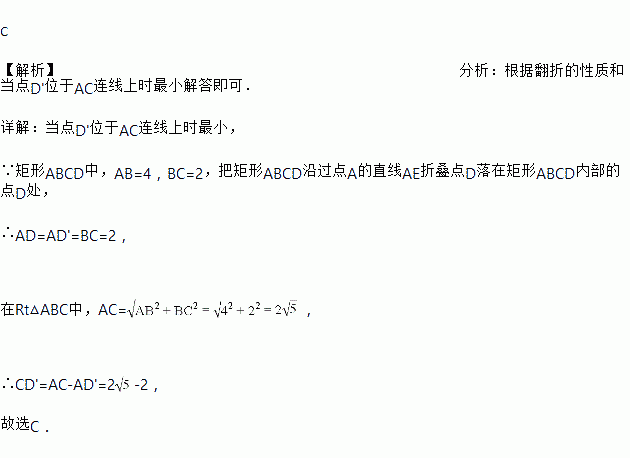 如图,矩形ABCD中,AB=4,BC=2,把矩形ABCD沿过点A的直线AE折叠点D落在矩形ABCD内部的点D处,则CD′的最小值是( )