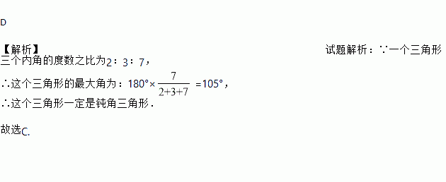 D 【解析】试题解析:∵一个三角形三个内角的度数之比为2:3:7, ∴这个三角形的最大角为:180°×=105°, ∴这个三角形一定是钝角三角形. 故选C.