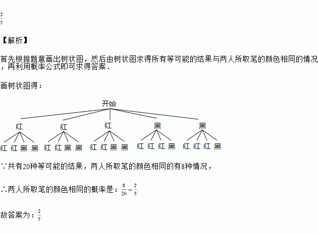 一个不透明的文具袋装有型号完全相同的支红笔和支黑笔,小明、小红两人先后从袋中随机取出一支笔(不放回),两人所取笔的颜色相同的概率是________.