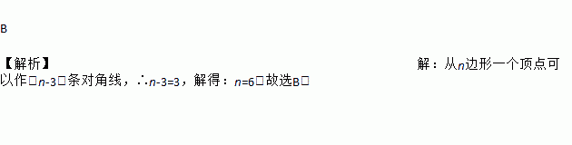 B 【解析】【解析】 从n边形一个顶点可以作(n-3)条对角线,∴n-3=3,解得:n=6.故选B.