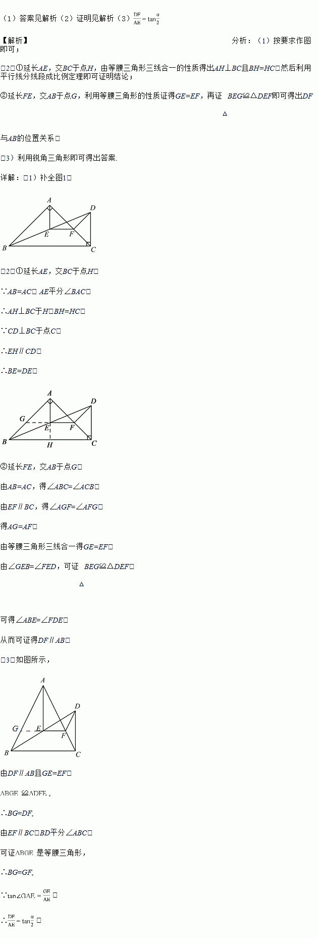 (3)如图2,当∠BAC=α时,直接写出α,DF,AE的关系.