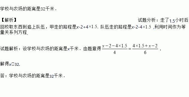 学校与农场的距离是32千米. 【解析】试题分析:走了1.5小时后回校取东西到追上队伍,甲走的路程是x-2+4队伍走的路程是x-2-4,利用时间作为等量关系列方程. 试题解析:设学校与农场的距离是x千米.由题意得. 解得x=32. 答:学校与农场的距离是32千米.