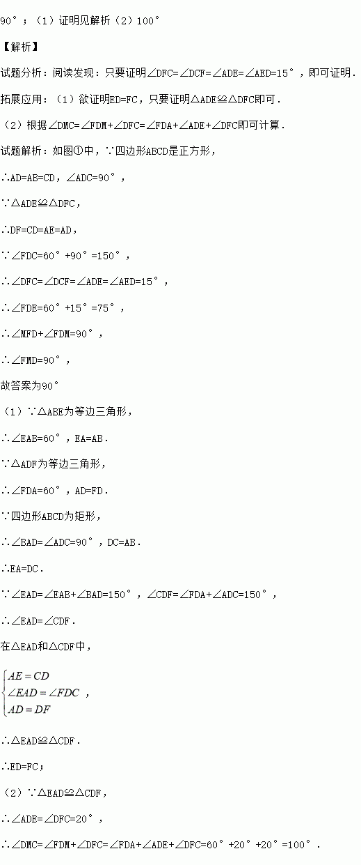 【拓展应用】如图②,在矩形ABCD(AB>BC)的外侧,作两个等边三角形ABE和ADF,连结ED与FC交于点M.