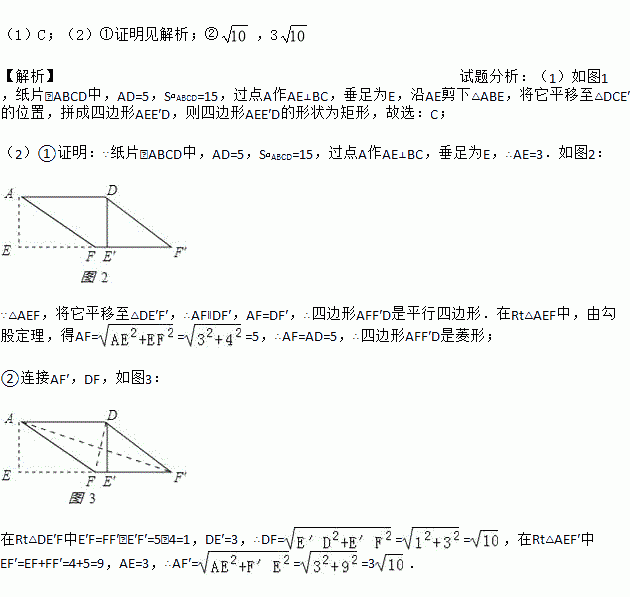 (1)C;(2)①证明见解析;②,3 【解析】试题分析:(1)如图1,纸片?ABCD中,AD=5,S?ABCD=15,过点A作AE⊥BC,垂足为E,沿AE剪下△ABE,将它平移至△DCE′的位置,拼成四边形AEE′D,则四边形AEE′D的形状为矩形,故选:C; (2)①证明:∵纸片?ABCD中,AD=5,S?ABCD=15,过点A作AE⊥BC,垂足为E,∴AE=3.如图2: ∵△...