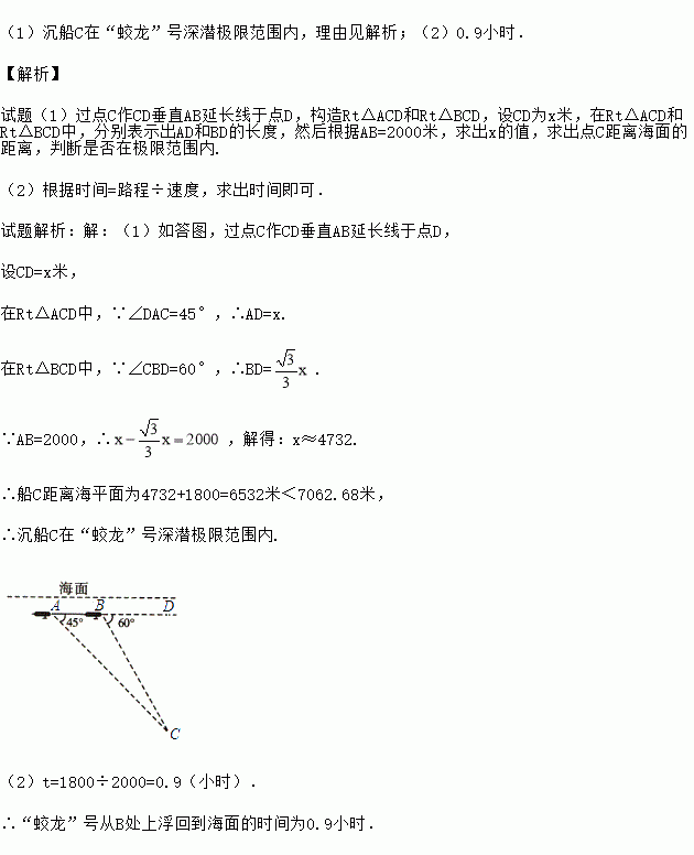 (1)沉船C是否在“蛟龙”号深潜极限范围内?并说明理由;