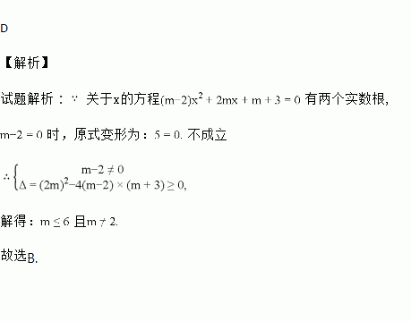 已知关于的方程(m-2)x2+2mx+m+3=0有实根,则m的取值范围是( )