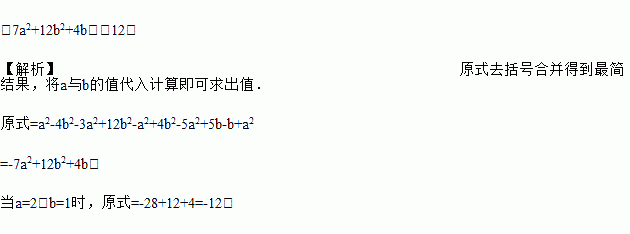 先化简,再求值:a2﹣4b2﹣3(a2﹣4b2)﹣a2+4b2﹣5(a2﹣b)﹣b+a2,其中a=2,b=1.