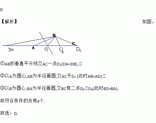 D 【解析】如图, ①AB的垂直平分线交AC一点D1(DA=DB),; ②以A为圆心,AB为半径画圆,交AC于D2 (此时AB=AD); ③以B为圆心,BA为半径画圆,交BC有二点D3,D4(此时BD=BA). 故符合条件的点有4个. 故选:D.