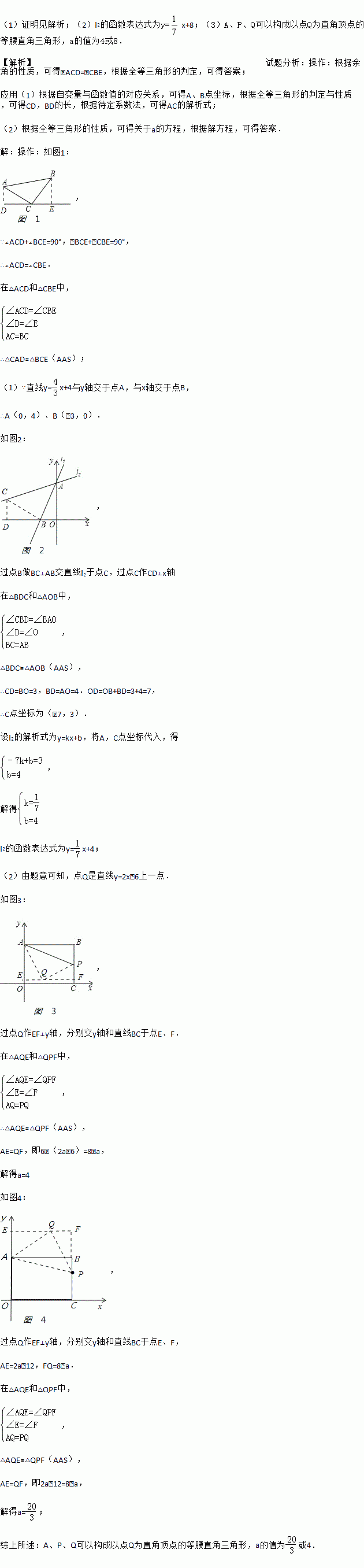 (1)如图 1,已知△ABC,AC=BC,∠C=90°,顶点C在直线 l 上.操作:过点A作AD⊥l于点D,过点B作BE⊥l于点E,求证△CAD≌△BCE.