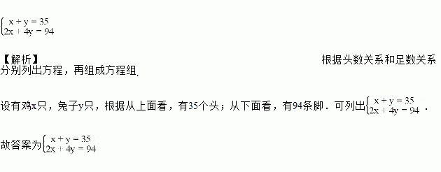 《孙子算经》是中国古代重要的数学著作,共三卷.卷上叙述了算筹记数的纵横相间制度和筹算乘除法,卷中举例说明筹算分数算法和筹算开平方法,卷下对后世的影响最深,其中卷下记载这样一道经典的问题:“今有雉兔同笼,上有三十五头,下有九十四足,问雉兔各几何?”意思是:“鸡和兔关在一个笼子里,从上面看,有35个头;从下面看,有94条脚.问笼中各有多少只鸡和多少只兔?”,设有鸡x只,兔子y只,可列方程组为_____________.