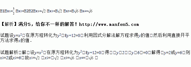 为解方程(x2﹣1)2﹣5(x2﹣1)+4=0,我们可以将x2﹣1视为一个整体,然后设x2﹣1=y,则原方程化为y2﹣5y+4=0,解此方程得:y1=1,y2=4.当y=1时,x2﹣1=1,x=±