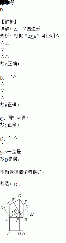 勾股定理是人类最伟大的十个科学发现之一,西方国家称之为毕达哥拉斯定理,但远在毕达哥拉斯出生之前,这一定理早已被人们所利用,世界上各个文明古国都对勾股定理的发现和研究作出过贡献(希腊、中国、埃及、巴比伦、印度等),特别是定理的证明,据说有400余种方法.其中在《几何原本》中有一种证明勾股定理的方法:如图所示,作CG⊥FH,垂足为G,交AB于点P,延长FA交DE于点S,然后将正方形ACED、正方形BCNM作等面积变形,得S正方形ACED=S?ACQS,S正方形BCNM=S?BCQT,这样就可以完成勾股定理的证明.对于该证明过程,下列结论错误的是( )