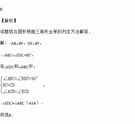 要测量河两岸相对的两点A、B的距离,先在AB的垂线BF上取两点C、D,使CD=BC,再定出BF的垂线DE,使A、C、E在同一条直线上,如图,可以得到△EDC≌△ABC,所以ED=AB,因此测得ED的长就是AB的长,判定△EDC≌△ABC的理由是( )