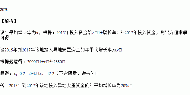 某地2015年为做好“精准扶贫”工作,投入资金2000万元用于异地安置,并规划投入资金逐年增加,2017年投入资金2880万元,求2015年到2017年该地投入异地安置资金的年平均增长率.