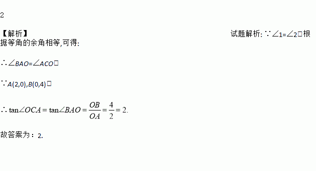 如图,已知两点A(2,0),B(0,4),且∠1=∠2,则tan∠OCA=________.