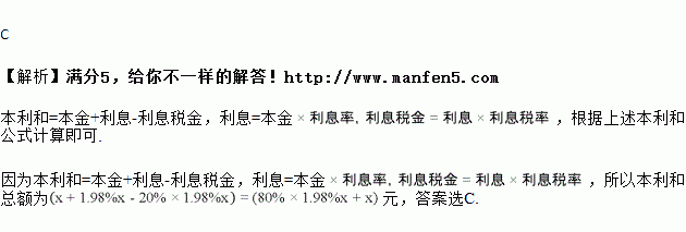 小勇在暑假参加了社会实践活动,他把攒得的元钱存入银行.已知一年的整存整取年利率为,利息税为,则一年后小勇实际能得到的本利和为( )