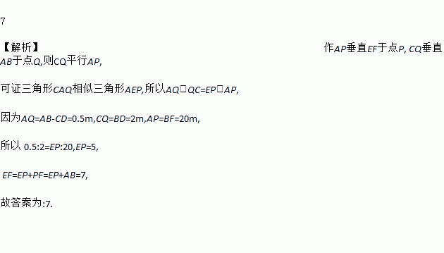 如图所示,冰冰在墙上挂了一面镜子AB,调整好标杆CD,正好通过标杆顶部在镜子上边缘A处看到旗杆的顶端E的影子,已知AB=2m,CD=1.5m,BD=2m,BF=20m,则旗杆EF的高度为__________m。