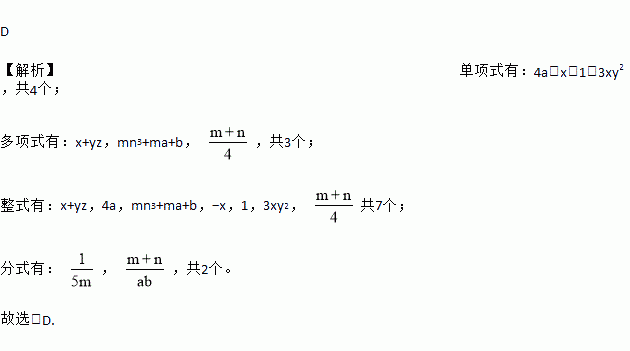 D 【解析】单项式有:4a,x,1,3xy2,共4个; 多项式有:x+yz,mn3+ma+b, ,共3个; 整式有:x+yz,4a,mn3+ma+b,?x,1,3xy2, 共7个; 分式有: , ,共2个。 故选:D.