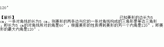 已知菱形的边长为5 cm,一条对角线的长为5 cm,则菱形的最大内角是_______.