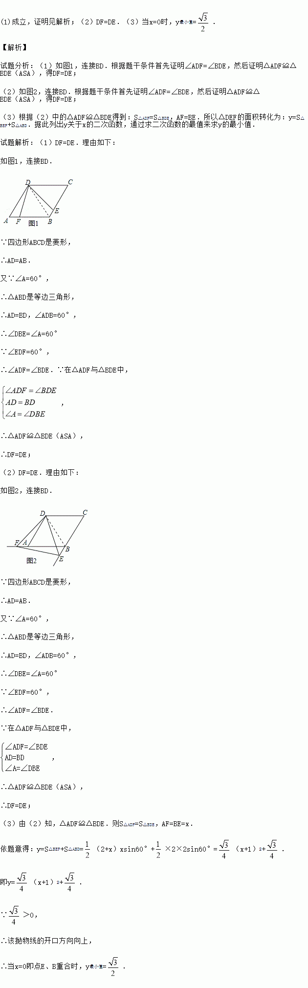 (1)成立,证明见解析;(2)DF=DE.(3)当x=0时,y最小值=. 【解析】 试题分析:(1)如图1,连接BD.根据题干条件首先证明∠ADF=∠BDE,然后证明△ADF≌△BDE(ASA),得DF=DE; (2)如图2,连接BD.根据题干条件首先证明∠ADF=∠BDE,然后证明△ADF≌△BDE(ASA),得DF=DE; (3)根据(2)中的△ADF≌△BDE得到:S...