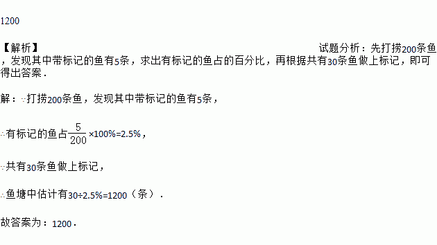 为了估计鱼塘中鱼的条数,养鱼者首先从鱼塘中打捞30条鱼做上标记,然后放归鱼塘,经过一段时间,等有标记的鱼完全混合于鱼群中,再打捞200条鱼,发现其中带标记的鱼有5条,则鱼塘中估计有________条鱼.