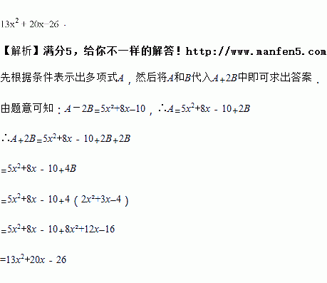 某同学做一道数学题,“已知两个多项式A、B,B=2x²+3x?4,试求A2B”.这位同学把“A+2B”误看成“A-2B”,结果求出的答案为5x²+8x?10.请你替这位同学求出“A+2B”的正确答案.