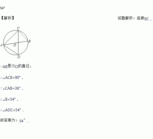 如图所示,AB是⊙O的直径,CD是⊙O的弦,连接AC,AD,若∠CAB=36°,则∠ADC的度数为________________.