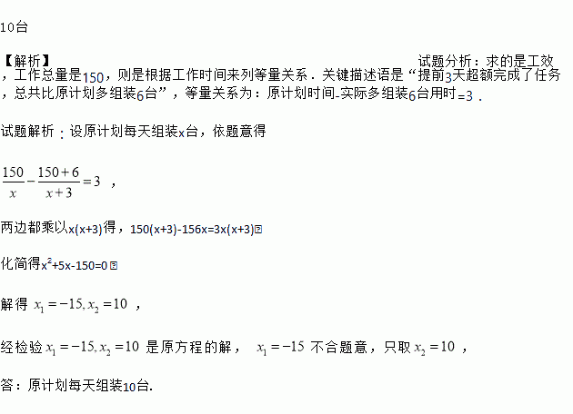 某空调厂的装配车间,原计划用若干天组装150台空调,厂家为了使空调提前上市,决定每天多组装3台,这样提前3天超额完成了任务,总共比原计划多组装6台,问原计划每天组装多少台?