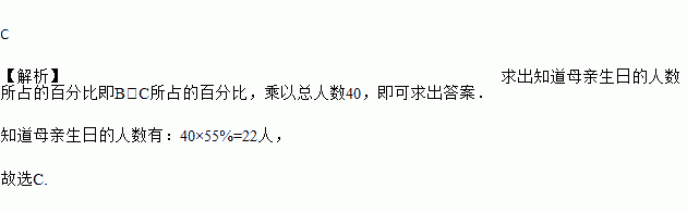 下图所示的扇形图是对某班学生知道父母生日情况的调查,A表示只知道父亲生日,B表示只知道母亲生日,C表示知道父母两人的生日,D表示都不知道.若该班有40名学生,则知道母亲生日的人数有( )