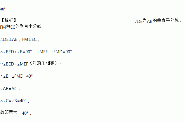 如图,在△ABC中,AB=AC,AB的垂直平分线DE交BC于E,EC的垂直平分线FM交DE的延长线于M,交EC于点F,若∠FMD=40°,则∠C=________.