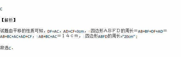 如图所示,将△ABC沿BC方向平移2 cm得到△DEF,若△ABC的周长为16 cm,则四边形ABFD的周长为 ( )