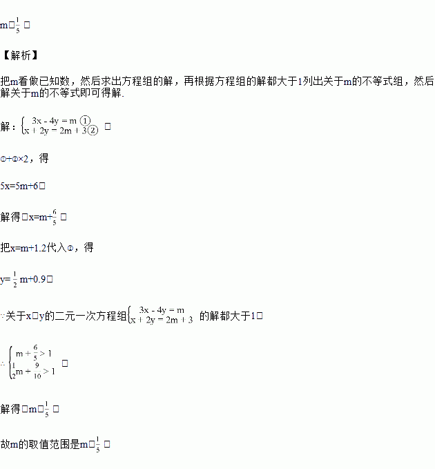 已知关于x、y的二元一次方程组的解都大于1,试求m的取值范围.