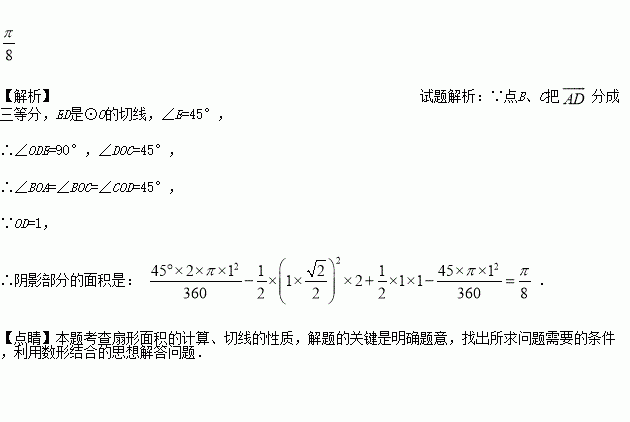 如图,点B、C把弧AD分成三等份,ED是⊙O的切线,过点B、C分别作半径的垂线段,已知E=45°,半径OD=1,则图中阴影部分的面积是_____.