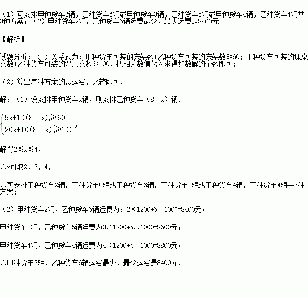 (2)若甲种货车每辆要付运输费1200元,乙种货车要付运输费1000元,则学校应选择哪种方案,使运输费最少?最少运费是多少?