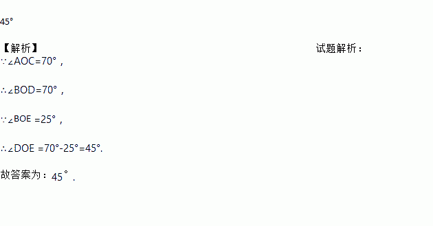 如图,直线AB、CD相交于点O,∠AOC=70°,∠BOE=25°,则∠DOE=______