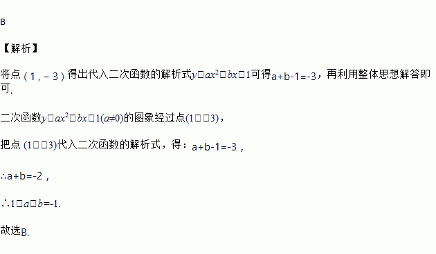 二次函数y=ax2+bx-1(a≠0)的图象经过点(1,-3),则代数式1+a+b的值为( )