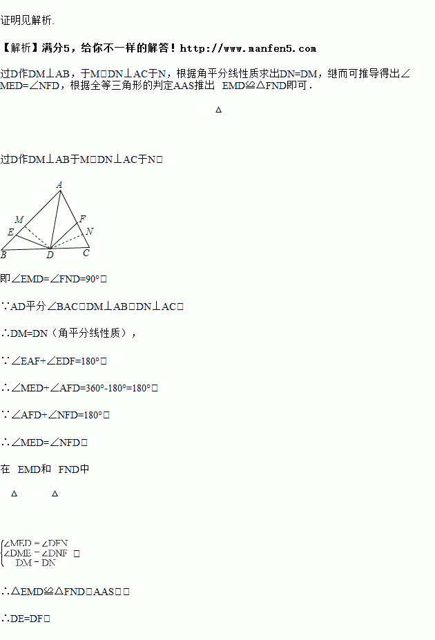 在△ABC中,AD是∠BAC的平分线,E、F分别为AB、AC上的点,且∠EDF+∠EAF=180°,求证DE=DF.